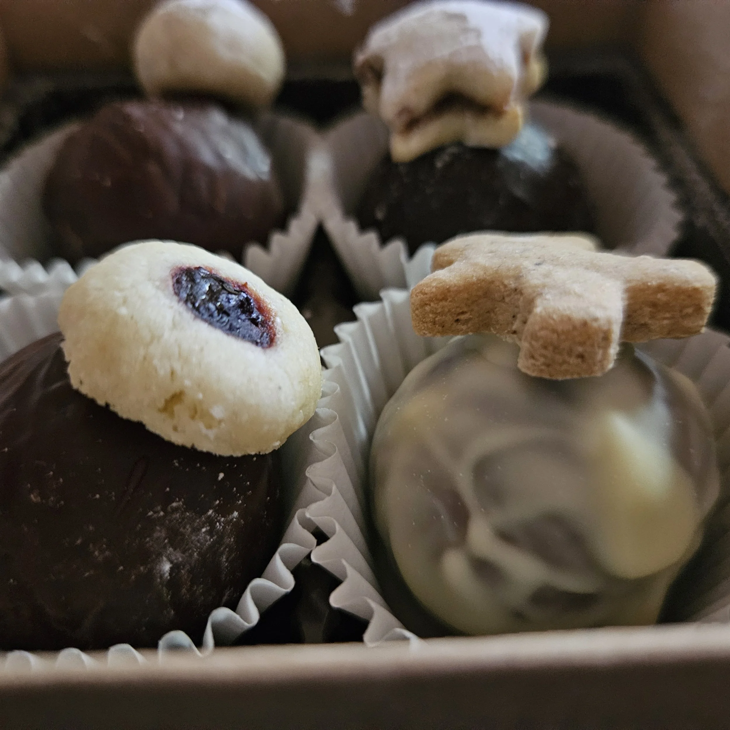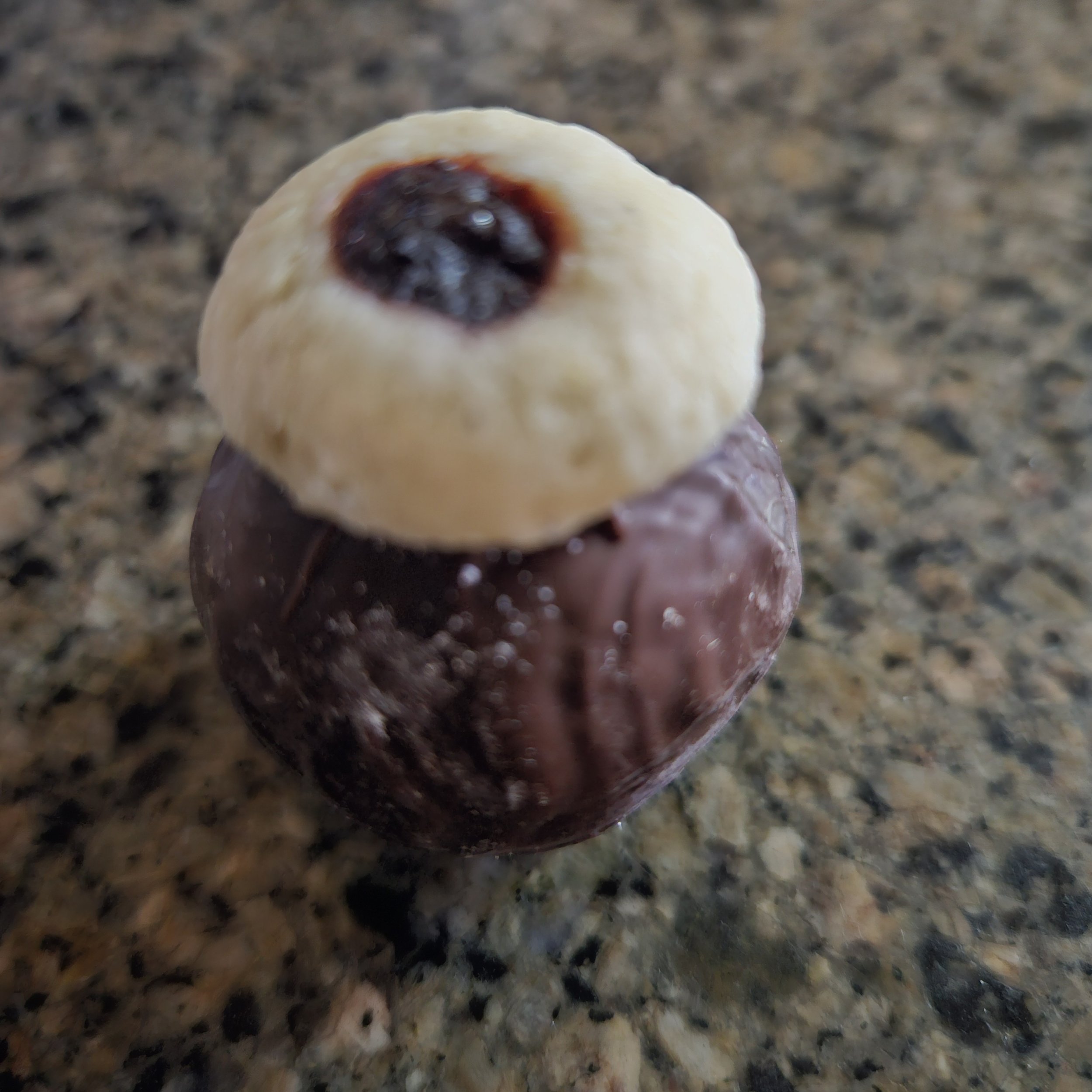 75% dark chocolate and 45% milk chocolate blend shell, cappuccino cream filling with butterball cookie